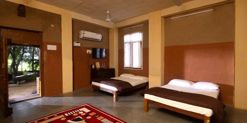 The Prabanjan Room reflects bold storytelling through its spacious design and vivid character. Every element — from rustic textures to artistic furnishings — celebrates individuality. This room is ideal for travelers who crave inspiration and space to create. Whether you’re reading by the window or gazing at the hills beyond, it promises warmth and clarity. Suitable for two guests, with two optional extra beds (₹500 each).